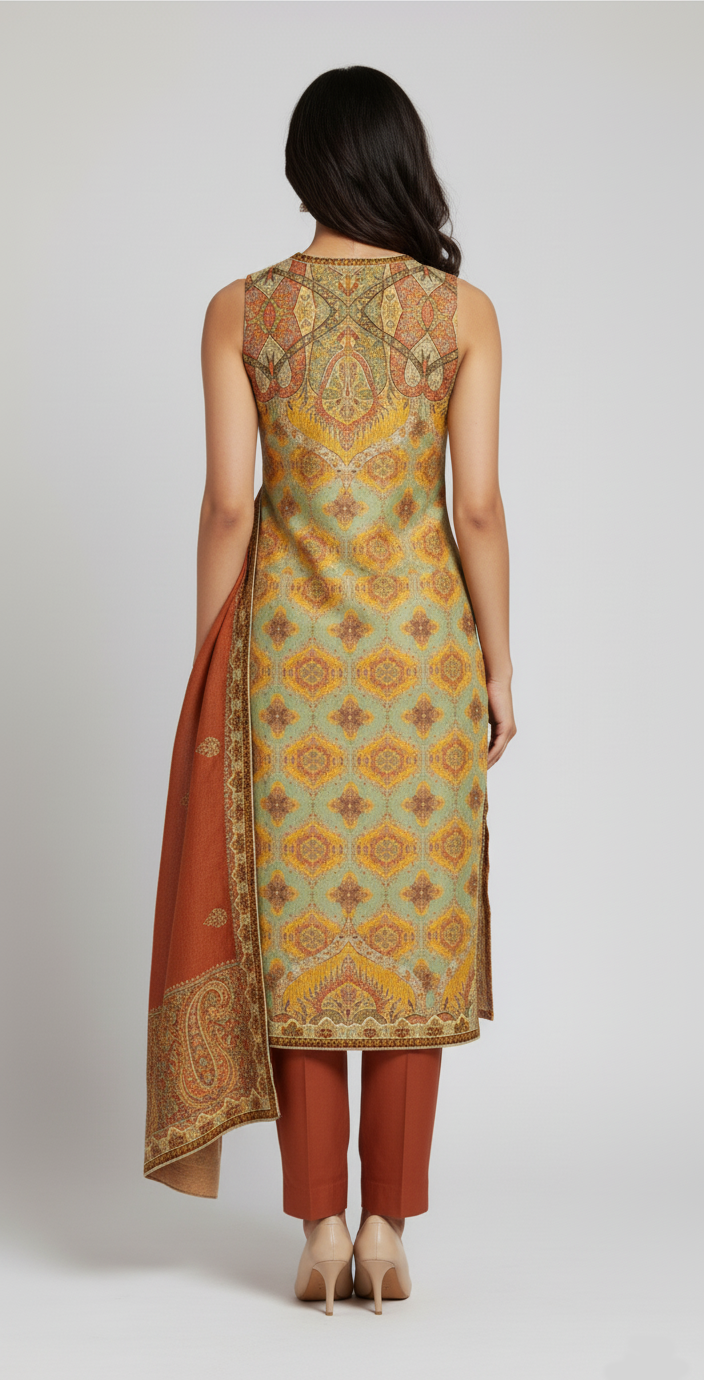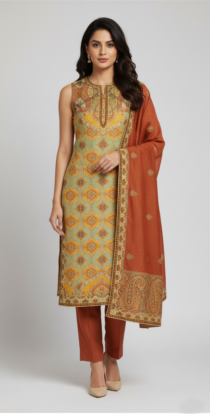 Embrace timeless elegance with this exquisitely crafted straight suit set, perfect for festive gatherings or sophisticated formal events. Inspired by traditional Kashmiri Jamawar textiles, this ensemble features a harmonious blend of earthy rust, sage green, and golden mustard tones.